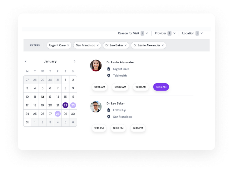 Our EMR-integrated website will surface all the appointments a verified patient is eligible for. They can search across multiple providers and locations on a single page and schedule in two clicks.
