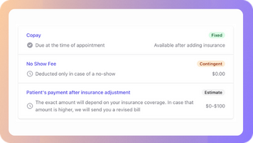 We create customized single checkout pages for your practice so that any patient scheduling a visit can set up automatic payments for co-pays, no-shows, co-insurance, and deductibles. Our patent-pending technology ensures that every patient sees a checkout page tailored to their situation.
